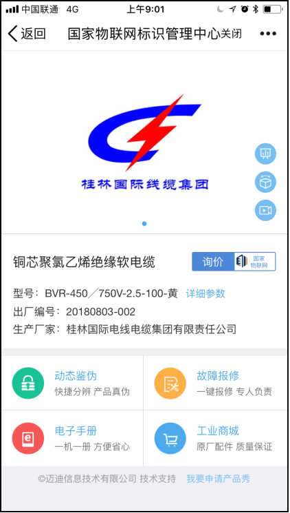通过线盘的一盘一码,对每一个进行正品打码,用户可以通过微信扫码查询产品真伪,迈迪物联码是迈迪与国家物品编码中心合作,通过国家物品编码中心领取物联码,可以完全防止外人仿造。