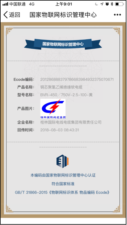 国标物联码标识认证:作为产品身份证,每一个产品物联码符合国家物联网编码Ecode标准,物联码数字编码及产品基础信息进入国家物联码档案备份。